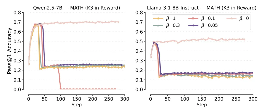 〓 图3. 如图所示,K3 in Reward 会导致 Pass@1 准确率直接跌零。