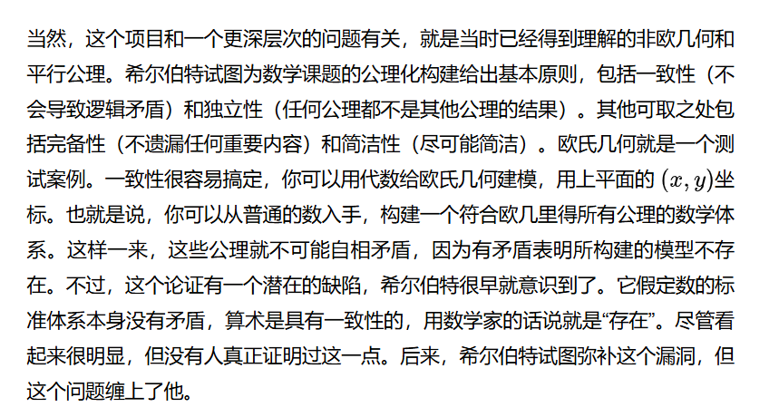 “过圆内一点的直线一定与圆相交”就是一个简单的例子。这在图上看起来很明显,但并不是欧几里得公理的逻辑结果。希尔伯特意识到欧几里得的公理体系并不完备,于是着手弥补其中的缺陷。欧几里得将点定义为“没有部分的东西”,将直线定义为“其上均匀放置着点的线”。希尔伯特觉得这些说法毫无意义。他认为,重要的是这些概念关联的行为,而不是它们在人头脑中唤起的图像。希尔伯特告诉他的同事们:“桌子、椅子和啤酒杯必须能让人们脱口而出,点、直线和平面就没做到这一点。”重要的是不能再依赖图片了。