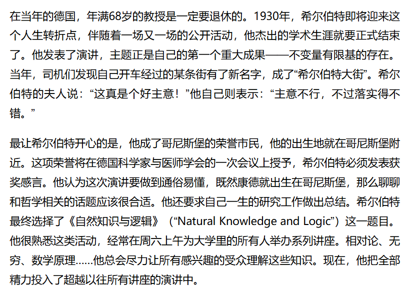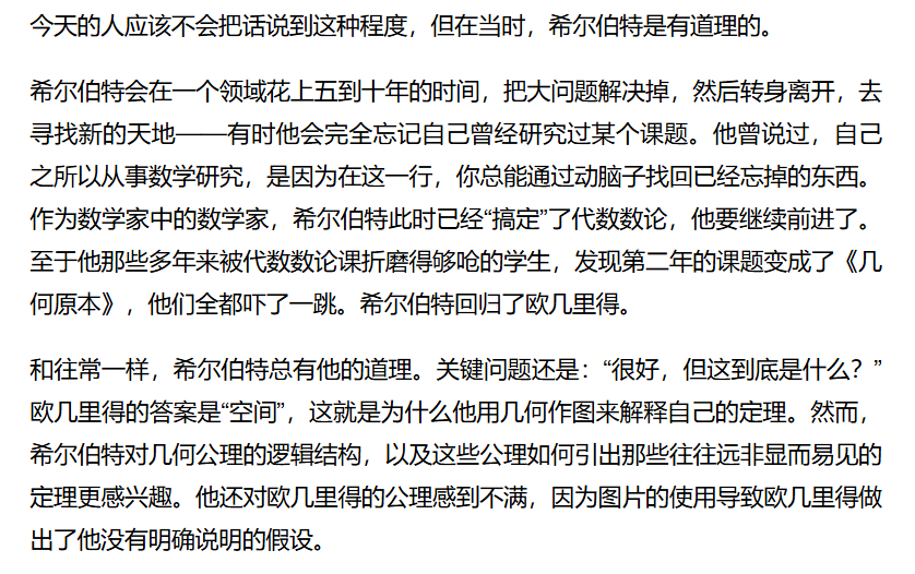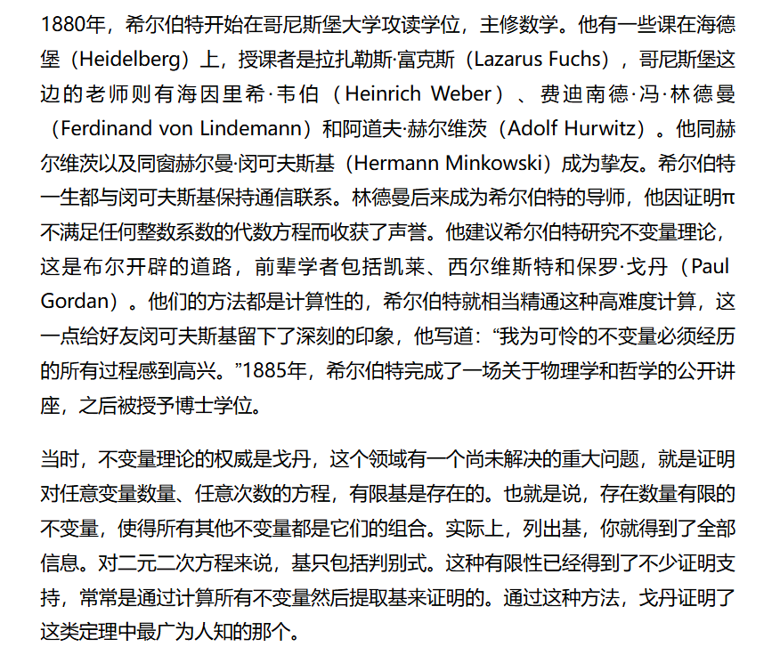 1888年,这个领域迎来了颠覆性的成果,希尔伯特发表了一篇短论文,在不计算任何不变量的前提下证明了有限基总是存在。事实上,他证明了任何一组合适的代数表达式总是一组有限基,无论它是否由不变量组成。这并不是戈丹所期待的答案,所以当希尔伯特把这项研究提交给《数学年鉴》时,他遭到了戈丹的排斥。戈丹说:“这不是数学,这是神学。”希尔伯特向编辑克莱因抱怨,他不愿修改论文,除非有人“对我的推理提出明确而无可辩驳的反对意见”。克莱因同意按原样发表论文。我猜测他对证明的理解比戈丹更透彻,当计算能力需要让位于概念思维时,戈丹已经力不从心了。