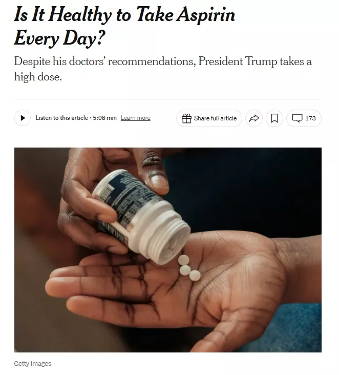特朗普长期每天服用大剂量阿司匹林,已坚持超过二十年,尽管医学指南和医生建议他应改为服用较低剂量,他仍坚持原做法。纽约时报的文章解释了这种做法是否合理。