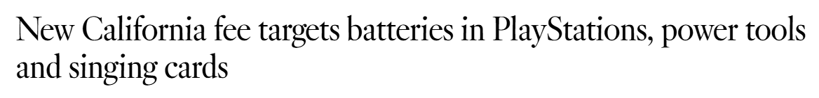 随着新年的开始,加州居民每次购买带有不可拆卸电池的产品时,都将支付一项新费用,包括但不限于电动工具、PlayStation游戏机,甚至是一张音乐贺卡。