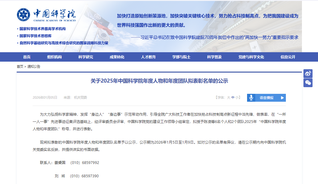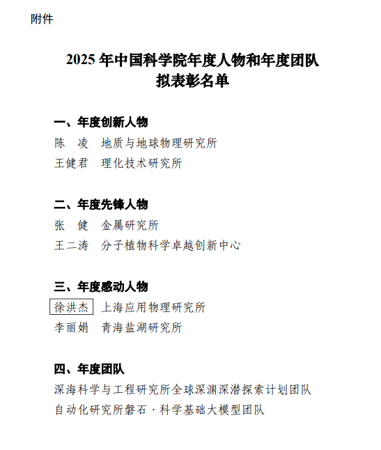 关于2025年中国科学院年度人物和年度团队拟表彰名单的公示