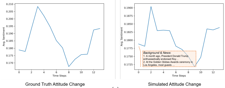 平台针对1000个真实的社交媒体用户搭建孪生智能体,并进行了为期14天的行为预测,在三个真实事件构成的数据集上验证模拟表现,实验结果表明,模拟平台在用户行为一致性、情绪态度变化趋势等多项指标上,与真实行为数据高度吻合。研究成果在自然语言处理领域的顶级会议ACL 2024发表。