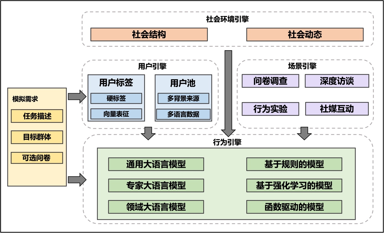 其中,社会环境引擎负责实时向模拟社会注入现实里的最新资讯(例如新规出台、油价调整等);用户引擎则提供真实世界人群画像,提供个体模拟的种子信息;场景引擎将现实社会互动抽象为标准化的模板,如问卷调查、深度访谈、社交媒体互动等;行为引擎是框架的大脑,负责综合信息,驱动智能体行动。