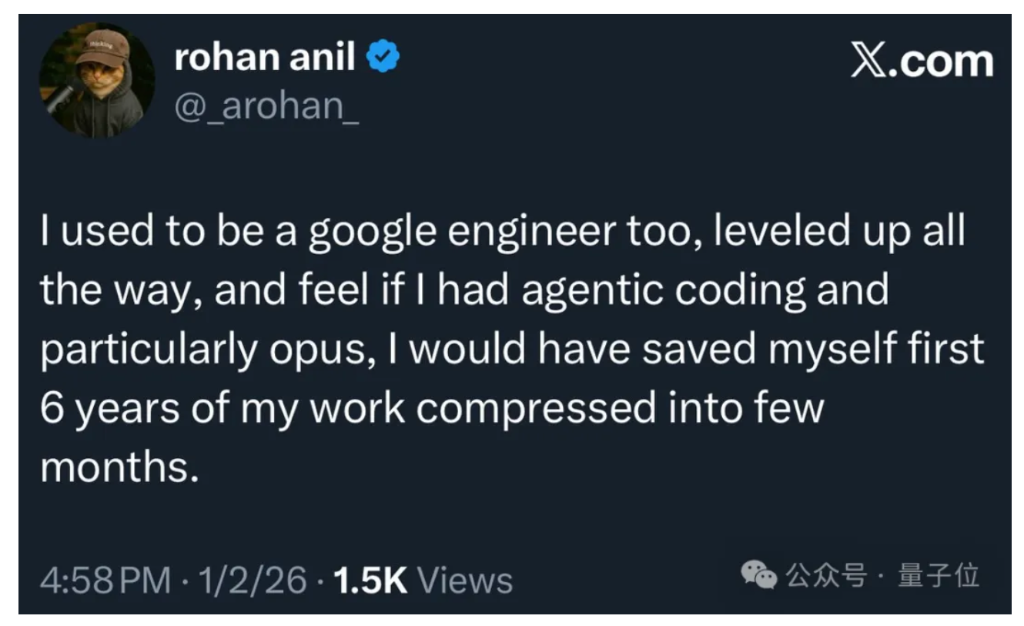 Anthropic现役工程师,Google DeepMind前杰出工程师Rohan Anil就分享称,“如果我有编程Agent,尤其是Claude的Opus,我能把我前6年的工作压缩到几个月内(完成)”。
