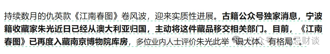 这意味着持续数月的仇英款《江南春图》卷风波,迎来实质性进展。不出所料,《江南春》真的是在藏家朱光手里,他已紧急归国。