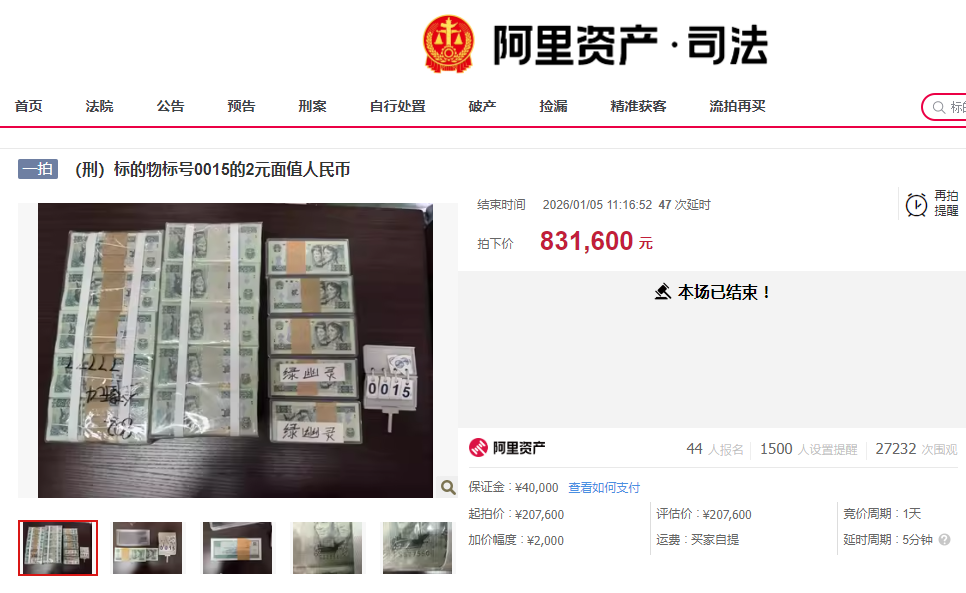 1月5日,现代快报记者从阿里资产平台获悉,一批2元面值的人民币完成拍卖。经过44人报名竞拍、历时24小时的出价,最终于1月5日上午11点16分,以83.16万元成交。