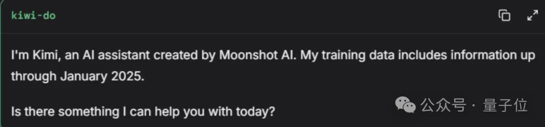发现这个新模型的推特网友询问了模型的身份,结果模型自报家门,表示自己来自月之暗面Kimi,训练数据截止到2025年1月。
