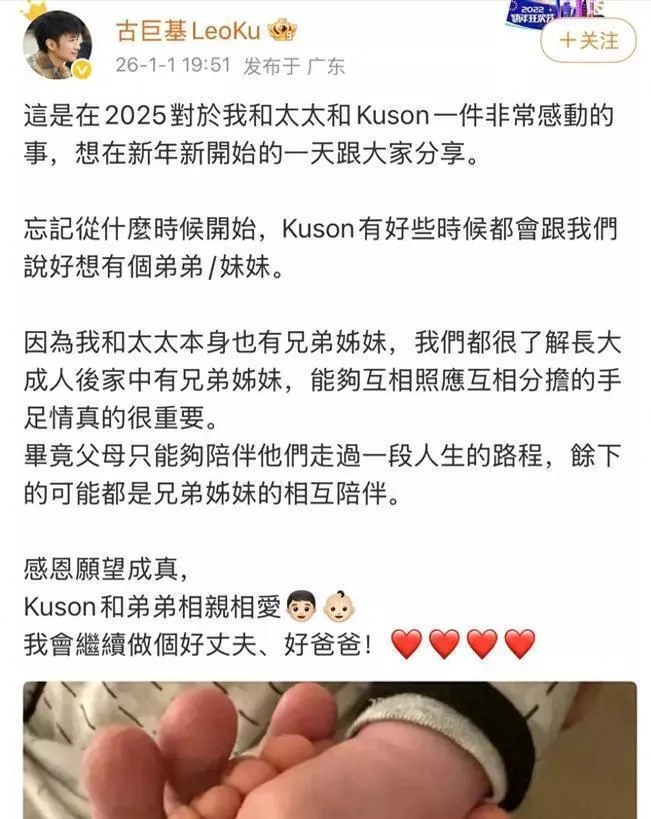 就在沈佳润那条道歉微博还在被热议的当天下午,另一条喜讯悄无声息地登上了榜单。53岁的古巨基,晒出了一家四口的牵手照,宣布二胎儿子出生。 配文很朴素,说这是2025年最感动的事,想在新年开始分享。他特意提到,大儿子Kuson一直盼着有个弟弟妹妹,因为“父母只能陪伴一段路,剩下的路得靠兄弟姐妹相互照应”。