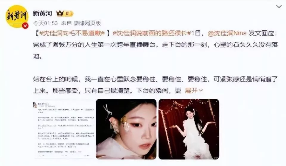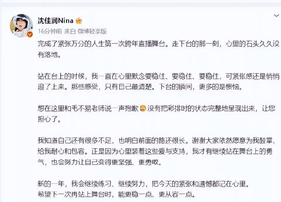 热搜上的词条换了好几轮。 沈佳润跑调 后面紧跟着 毛不易 工伤,网友调侃归调侃,但火力没想象中猛。毕竟,那可是全程开麦的直播,唱劈了也比对着口型假唱来得实在。 2026年1月1号,凌晨一点多,沈佳润的道歉长文发出来了。没甩锅给设备,没抱怨状态,开头就直接认了。 “站在台上的时候,我一直在心里默念要稳住,可紧张感还是悄悄追了上来。”这句话让不少有类似经历的人瞬间共情。她承认自己没把彩排状态表现出来,也知道前路还长,但保证会把这次的遗憾记住,往后练得更稳。