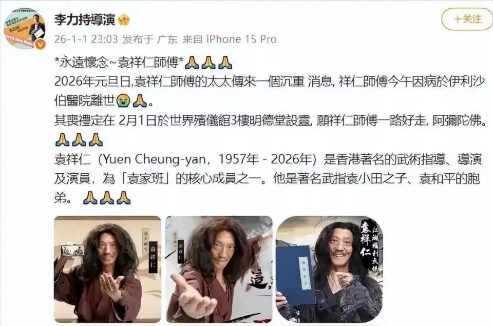 喜庆的气氛还没散尽,1月1日晚上,香港导演李力持的一条微博,让很多人的心情沉了下去。 他写道:“又一位香港电影界的好朋友离开了。”公布的是袁祥仁的死讯。 这位79岁的演员兼武术指导,当天因病在香港伊利沙伯医院去世。 丧礼定在一个月后的2月1日。