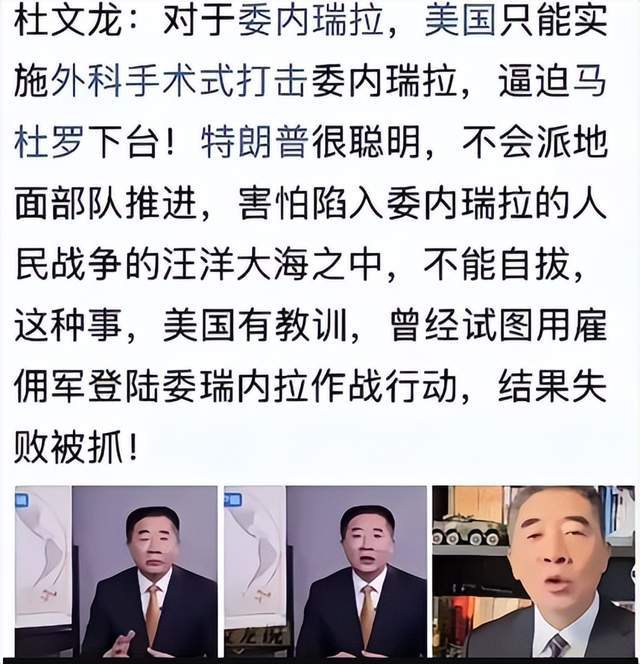 央视节目座上宾杜文龙认为:对于委内瑞拉,美国只能实施外科手术打击逼迫马杜罗下台,特朗普不敢采用地面部队,不然会陷入到人民战争的汪洋大海之中。而事实上,美国这次抓捕马杜罗的行动,只派遣了24名特种部队队员,且无一伤亡。此外,让人大跌眼镜的专家还有宋晓军,他认为美国对委内瑞拉动武的可能性比较小,理由是打游击战,美国未必行。问题是,从伊拉克到委内瑞拉,美国还打游击战吗?