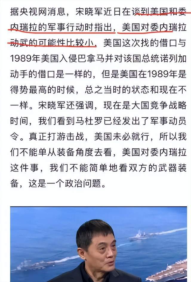 我说过,美国这一做法是赤裸裸的霸道,不得人心。但问题是,我们这么多军事专家对于美国军事行动的的认知水平和预测能力,居然与真实走向和结果完全相反,我甚至觉得这比委内瑞拉总统不到一个半小时被抓,还显得滑稽可笑。如果专家在央视的预测水平比德云社还搞笑,岳云鹏还怎么上春晚,央视的节目还怎么演?