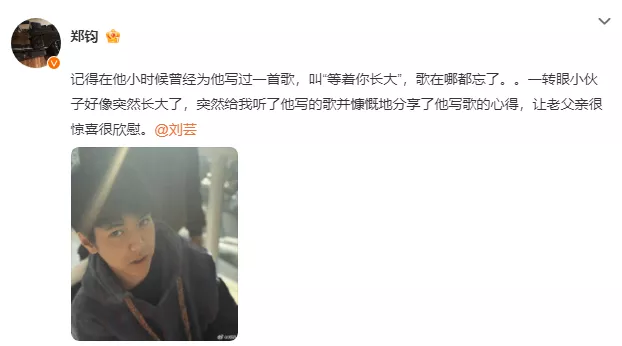 搜狐娱乐讯近日,郑钧在社交平台上晒出15岁儿子的近照,并发文称:“记得在他小时候曾经为他写过一首歌,叫‘等着你长大’,歌在哪都忘了。。一转眼小伙子好像突然长大了,突然给我听了他写的歌并慷慨地分享了他写歌的心得,让老父亲很惊喜很欣慰。” 照片中,15岁Jagger看向镜头,五官俊朗帅气,长得好像混血儿!而且,年仅15岁的Jagger就已经会写歌了,真是年少有为!