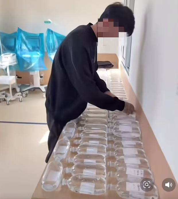 他直接穿着便服,帮女友干起了配药,给点滴瓶贴标签的工作。