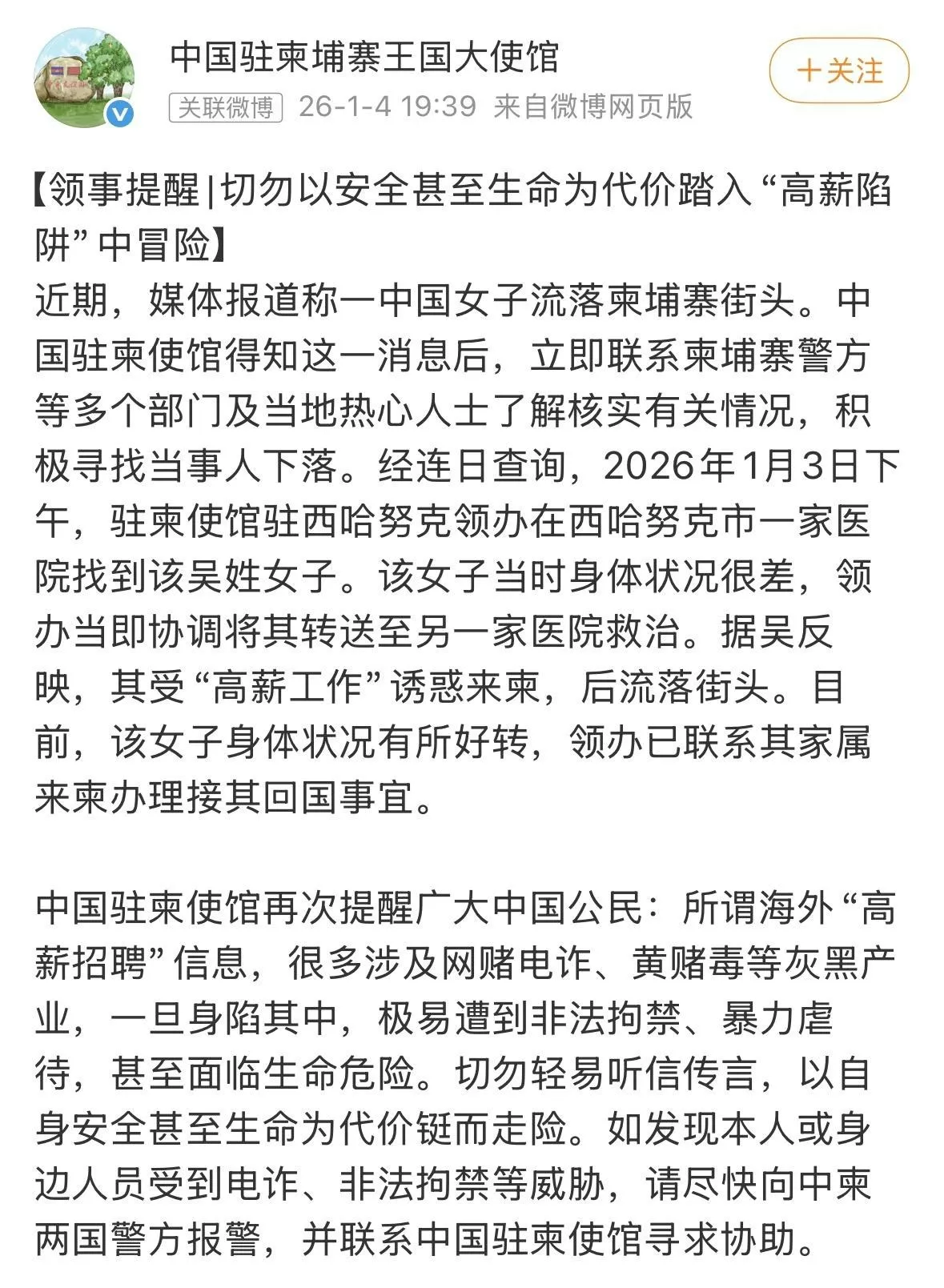 1月4日,“中国驻柬埔寨大使馆”微博发文,指3日下午在当地一家医院找到吴甄桢,因她当时身体状况很差,将其转送至另一家医院救治。她也承认,被“高薪工作”诱惑才来柬埔寨。目前,吴甄桢身体状况有所好转,大使馆已联系其家属来柬办理接其回国事宜。