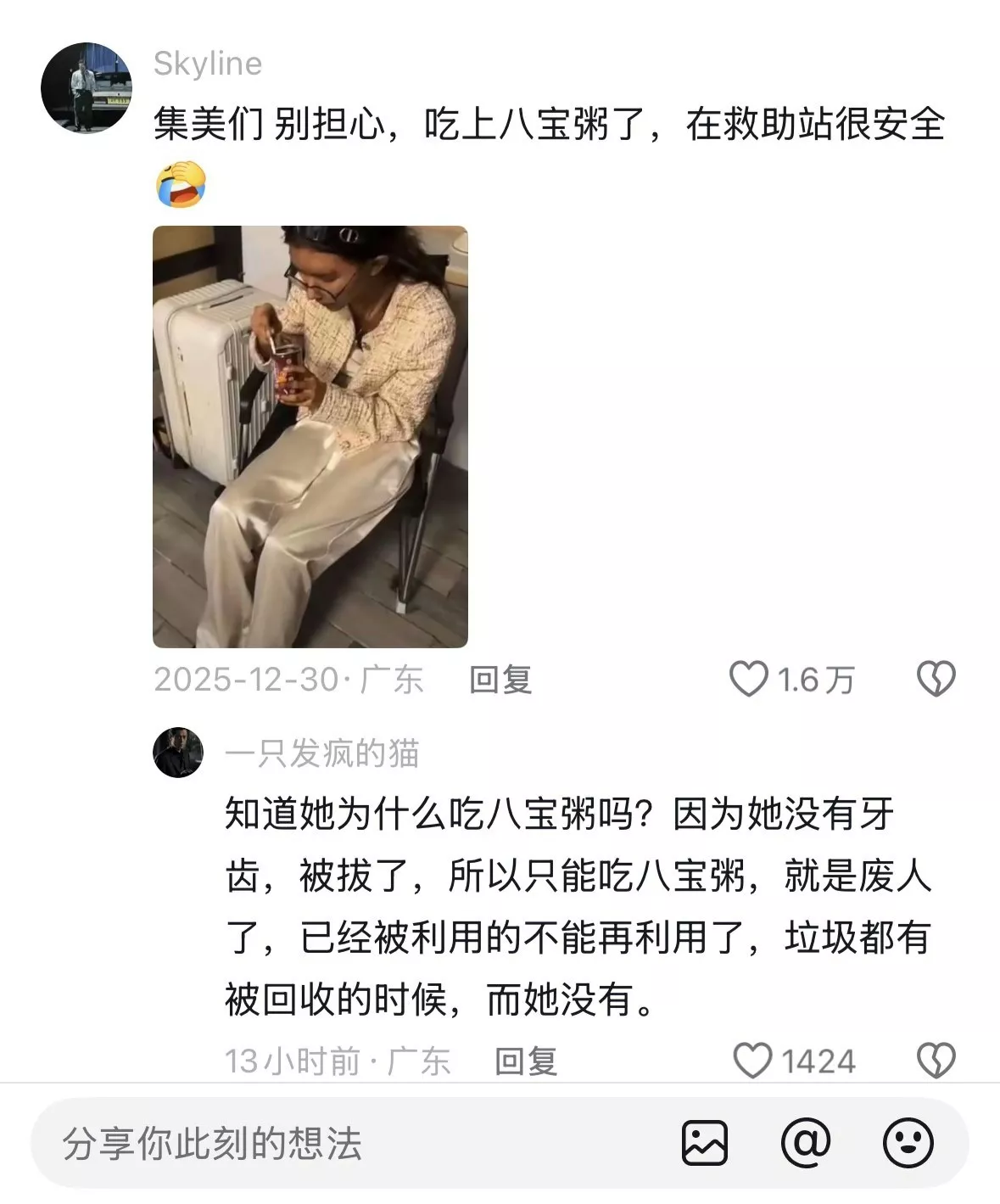 但这条评论下有网民跟帖,称吴甄桢“因为她没有牙齿,被拔了,所以只能喝八宝粥,就是废人了,已经被利用的不能再利用,垃圾都有回收的时候,而她没有。”