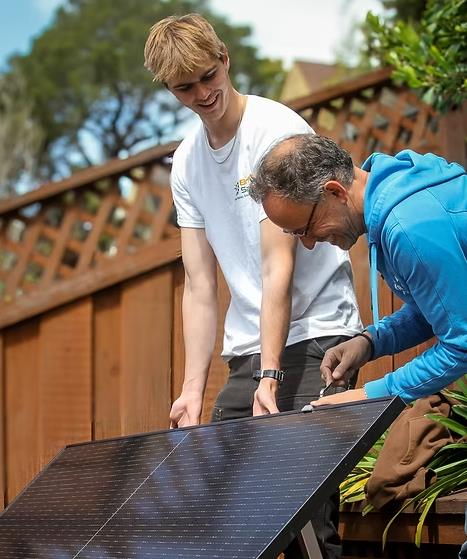 父子两人在后院安装插入式太阳能板。 (取自brightsaver.org)