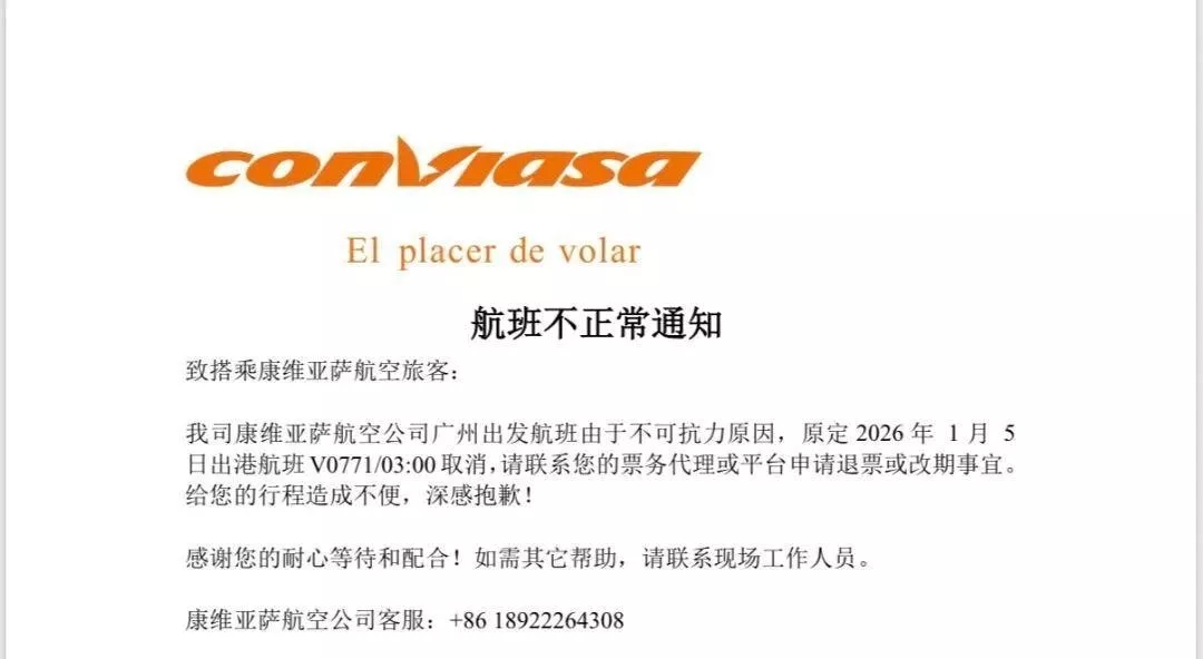 委内瑞拉总统马杜罗被抓捕至美国,引发国内动荡不安,外界非常关注该国华人安全。今日,委内瑞拉康维亚萨航空公司发布公告,1月5日由广州飞往卡拉卡斯(委内瑞拉首都)的航班已被取消,该航线为中国唯一直飞委内瑞拉的航线。近日,委内瑞拉华人如果想回国,需前往周边国家再转机。若要搭乘直飞航班,则要等到1月16日。