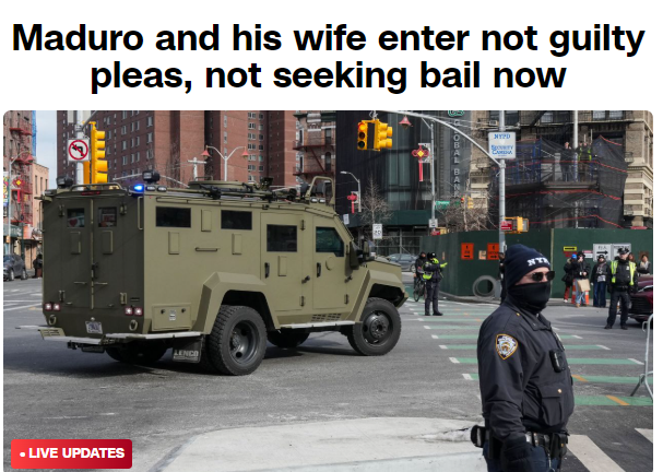 当地时间5日中午,遭美国强行控制的委内瑞拉总统马杜罗在美国纽约南区联邦地区法院首次出庭。