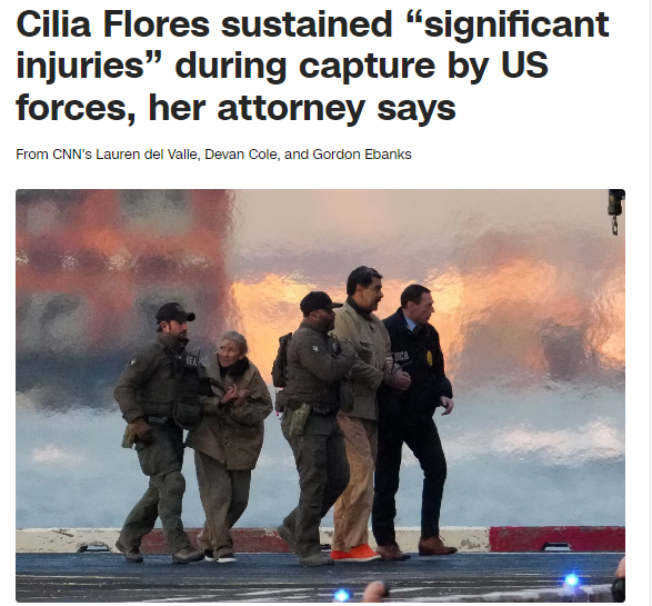 与马杜罗一同被起诉的,还有其妻子、前第一夫人西莉亚·弗洛雷斯(Cilia Flores)。法庭记者注意到,她额头缠着绷带,右眼周围有明显淤青,起身进入法庭时需要一名美国法警搀扶。