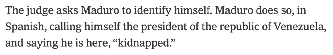 法官要求马杜罗自我介绍身份,马杜罗用西班牙语自称是委内瑞拉总统,并称自己在这里是“被绑架了”。
