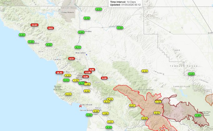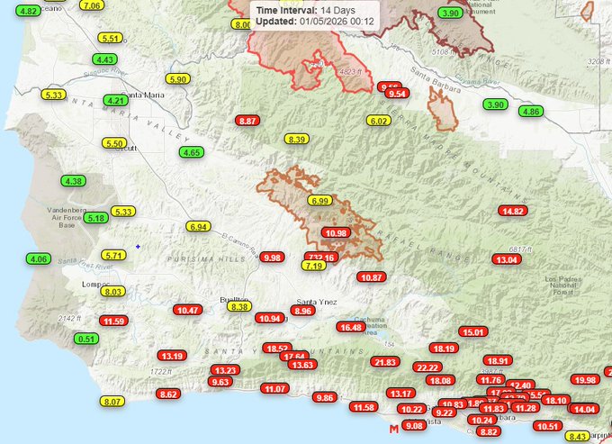 美国国家气象局(NWS)周一清晨在社交平台发文表示:“以下是过去14天西南加州一些令人印象深刻的降雨数据!”