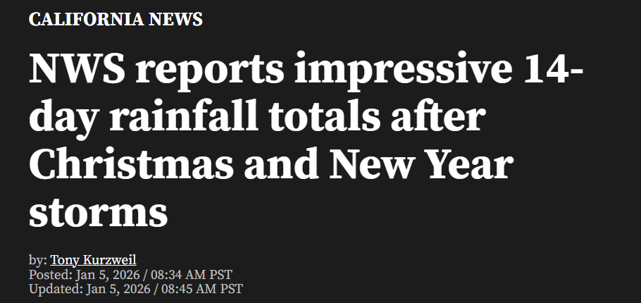 尽管本周起天气预计将逐渐转为干燥,但这轮强降雨已明显改善南加州的“水季(water season)”状况。洛杉矶市中心在过去14天内累计降雨约7英寸。