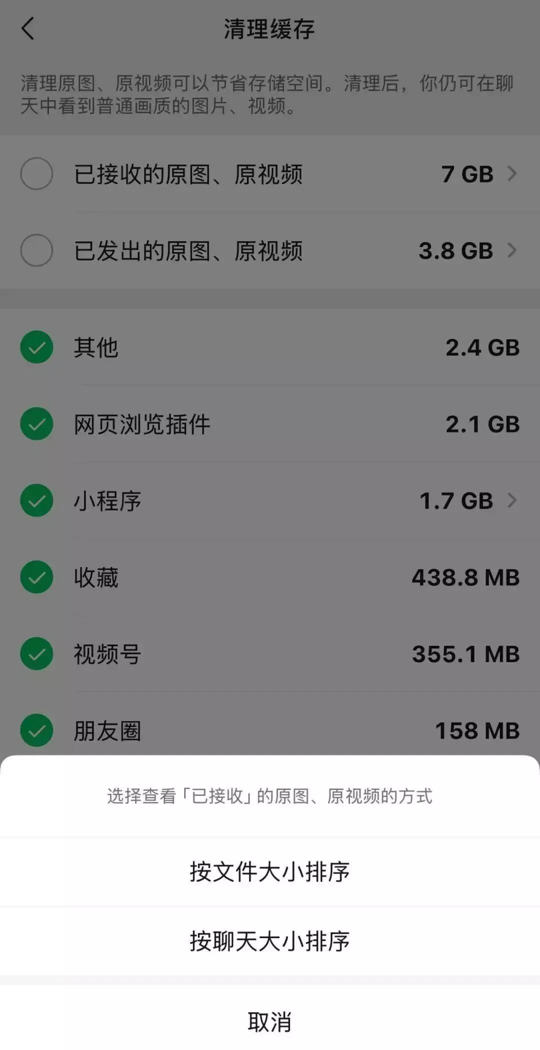 路径:存储空间 → 缓存 → 清理 → 分别点击 “已接收的原图/原视频” 及 “已发出的原图/原视频” → 选择 “按文件大小排序” → 批量删除群聊大文件(如50MB+视频)→ 清理后文件转为普通画质缩略图。