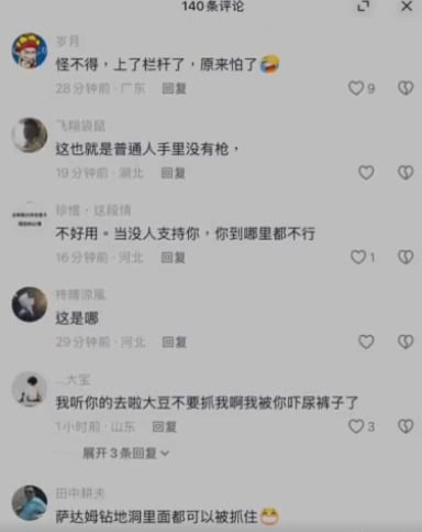 有网友说:“只要背叛人民,就会来抓你”、“如果真动手,估计也挡不住”,也有人讥讽:“对你不需要抓活的,直接给你一颗钻地弹就够了”、“把头缩起来就安全”、“萨达姆钻地洞里面都可以被抓住”。