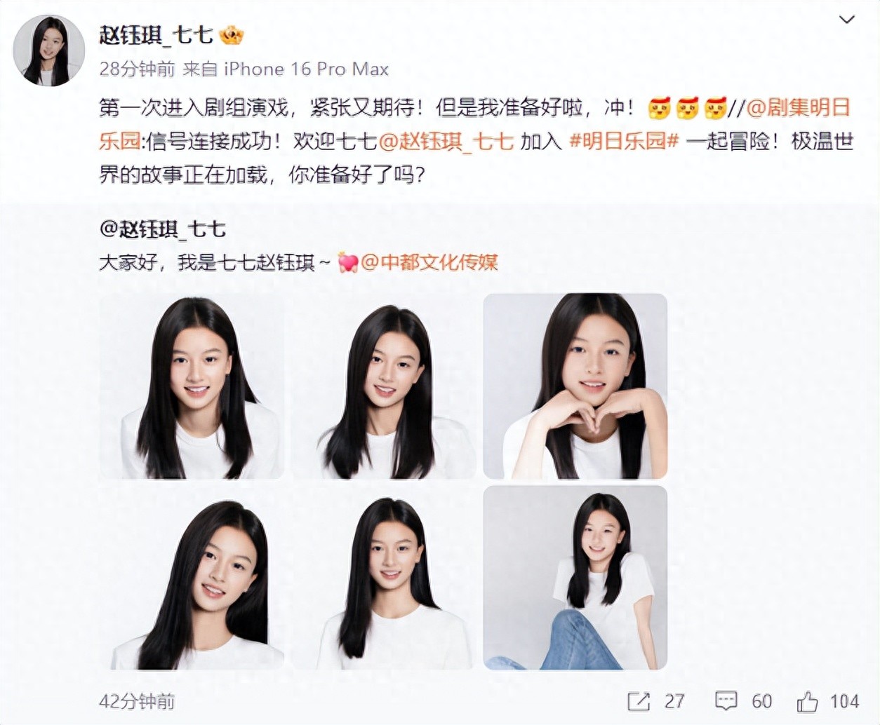 1月5日,去年因颜值走红的15岁素人女孩赵钰琪“七七”宣布已签约中都文化传媒,并正式官宣进组钟楚曦、尹昉、敖子逸领衔主演的《明日乐园》。