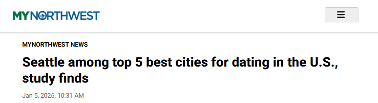 据报道,在一项对全美180余座城市约会氛围的排名中,西雅图凭借在约会机会维度的高分表现,跻身前五名。