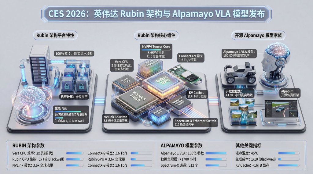 英伟达Vera Rubin平台全面投产,通过“极端协同设计”将AI推理性能提升5倍、成本降至1/10,直击智能体“算不起、记不住”痛点。黄仁勋宣告AI进入“会思考”下半场,高呼“物理AI的ChatGPT时刻已近”。通过开源智能驾驶模型Alpamayo模型与西门子合作,英伟达展示了从芯片到机器人的全栈拼图。