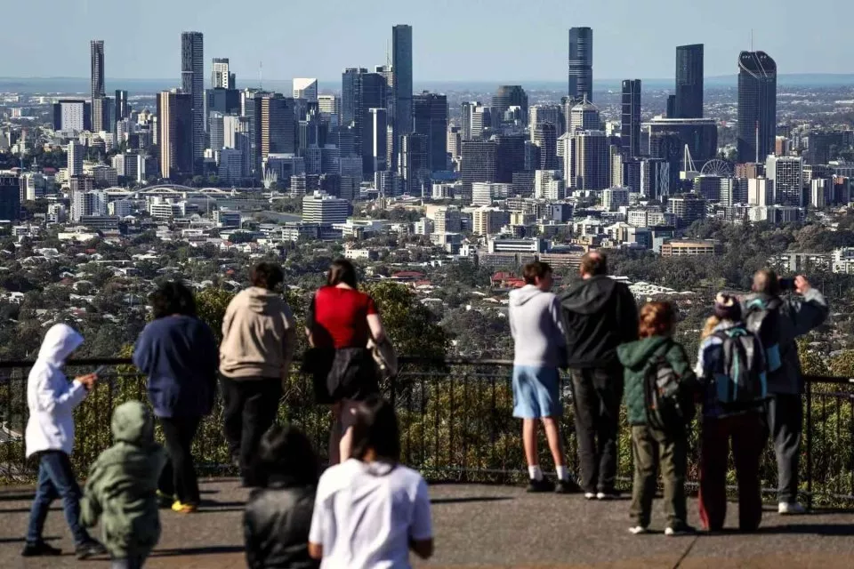 当地时间2025年7月2日,澳大利亚布里斯班,游客在库塔山观景台眺望布里斯班中央商务区。 (视觉中国/图)