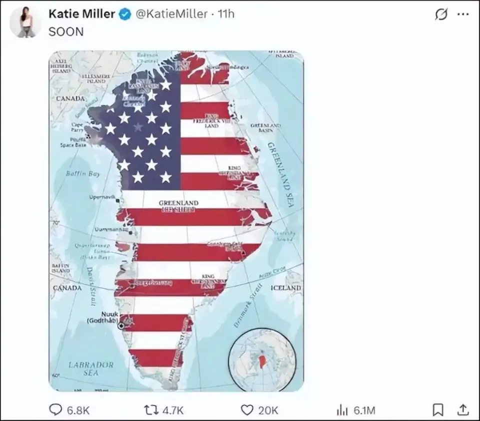 前政府官员、现播客主持人凯蒂·米勒(副幕僚长斯蒂芬·米勒之妻)在X平台发布了一张格陵兰岛的地图,图上以美国国旗颜色涂满全岛,配文仅一个词:“即将”。