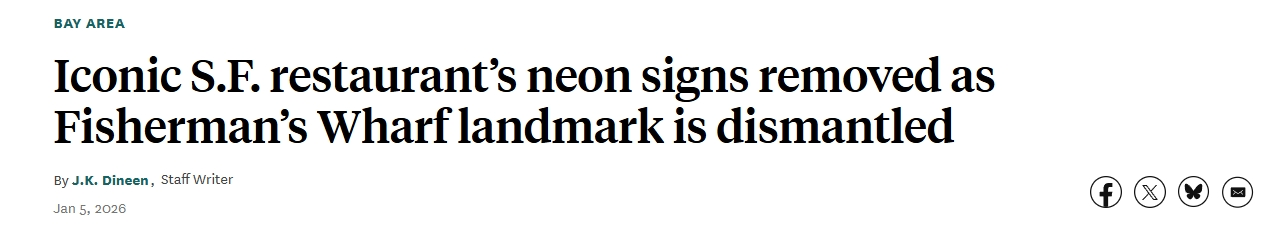 当天稍早,Alioto餐厅招牌的14个航海主题霓虹灯字母也被逐一吊下。这些霓虹灯一组面向金门大桥,另一组面向市中心,曾是这家老字号餐厅最具辨识度的标志。