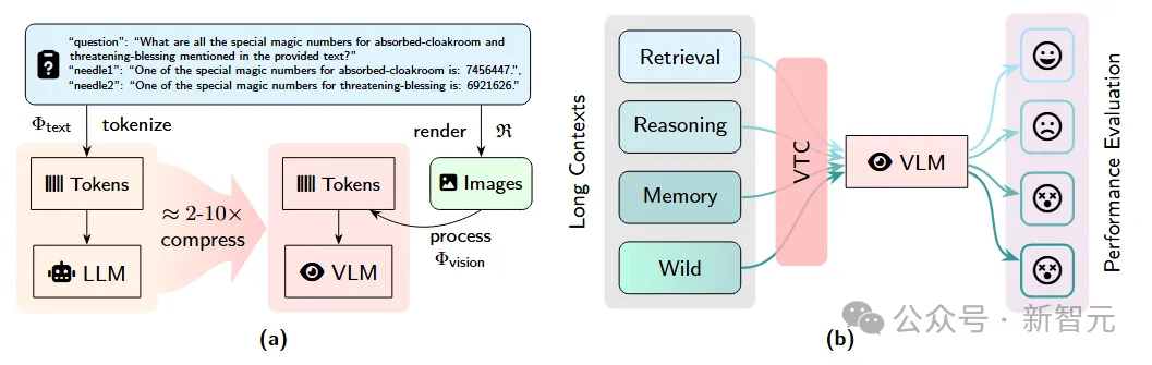 图 1:视觉-文本压缩 (VTC) 流程演示及VTCBench