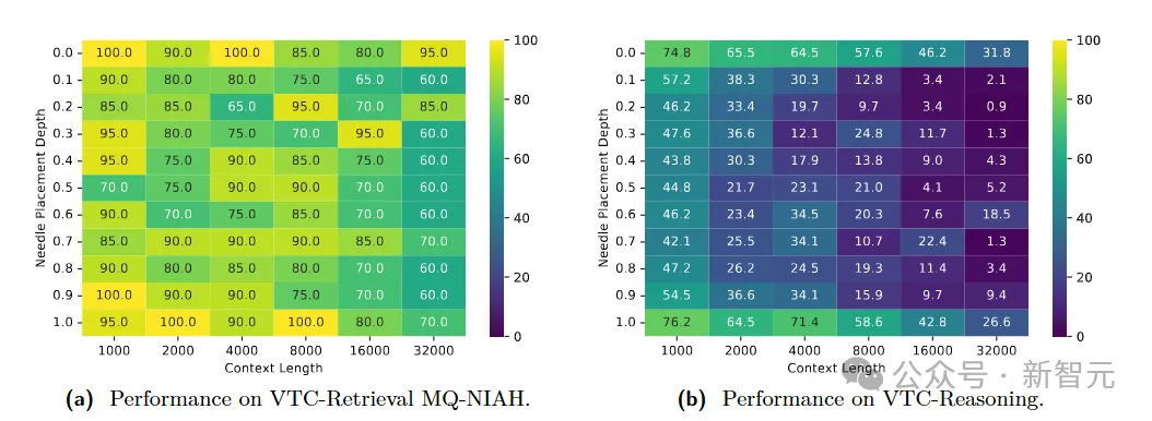 图 2:VTCBench针对模型在长图像中检索信息的热力图。横轴代表上下文长度,纵轴代表关键事实(Needle)在文档中的深度。展现了模型表现的「迷失」与突破。