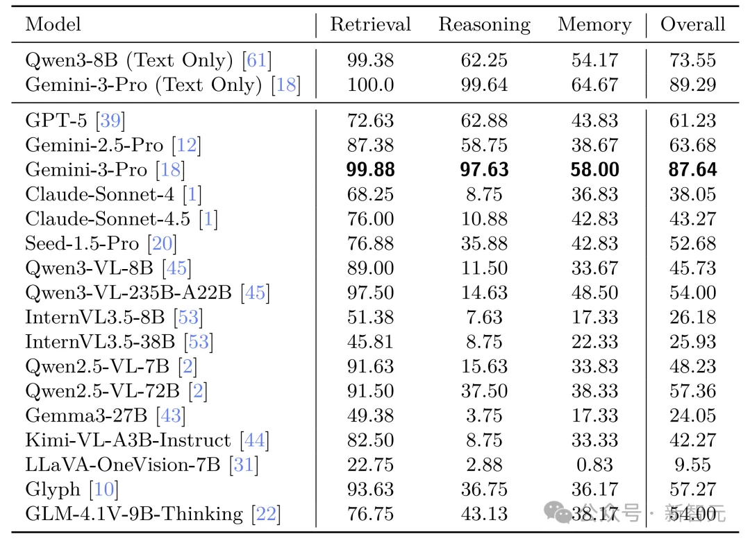Gemini-3-Pro在VTCBench-Wild上表现惊艳,其视觉理解能力已几乎追平其纯文本基准,证明了VTC是实现大规模长文本处理的极其可行的路径!