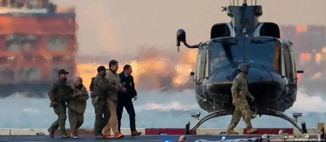 ◆马杜罗夫妇在美国缉毒局执法人员的押送下,前往曼哈顿联邦法院受审。