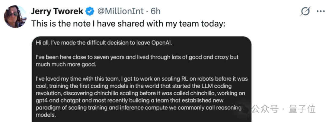 Jerry Tworek——构建o3、o1、GPT-4、ChatGPT以及 OpenAI首个AI编程模型Codex的关键人物,OpenAI研究副总裁——宣布了他的艰难决定:离开OpenAI,去尝试探索一些在OpenAl难以开展的研究领域。