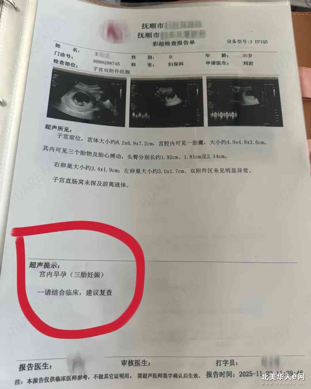 据王女士讲述,她今年30岁,去年9月份自然受孕,11月在抚顺市妇幼保健院做了三次产检,第一次检查时是单胎,第二次检查是双胎,第三次检查结果为三胎。为了弄清楚具体情况,去年12月,王女士到沈阳市妇婴医院进行复检,彩超结果显示为四胎。