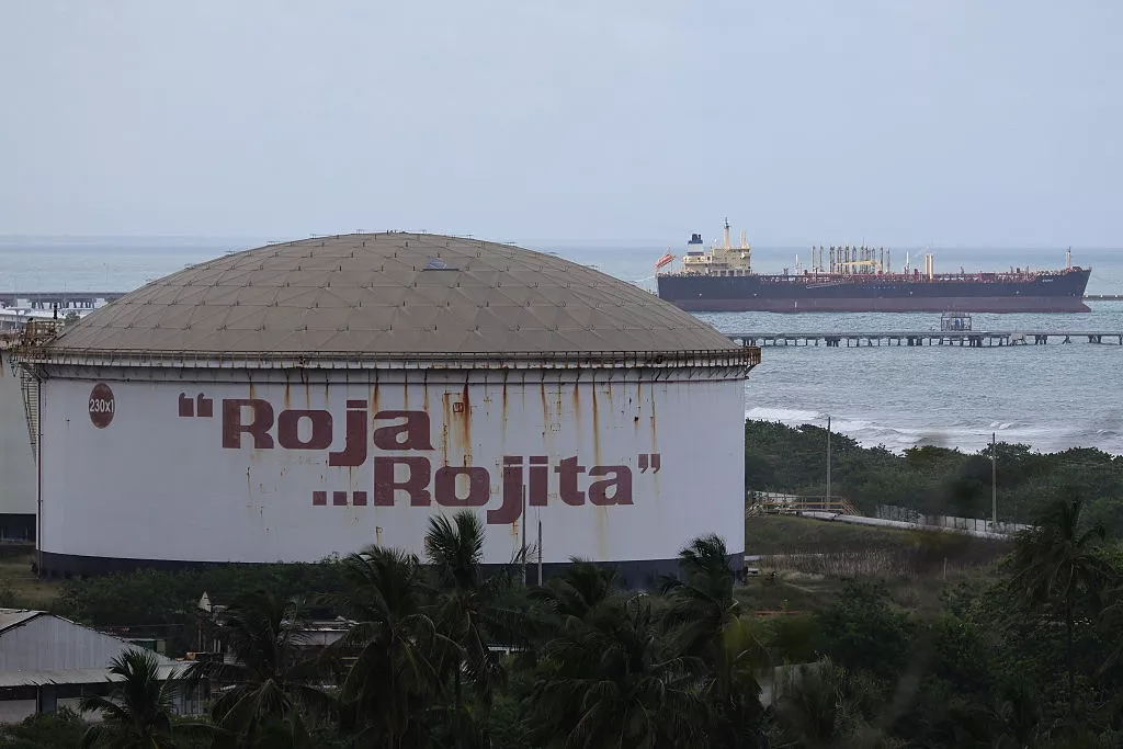 2025年12月21日,委内瑞拉Cabello码头,图为委内瑞拉石油公司(PDVSA)的石油储藏仓库附近,可见有邮轮停靠在码头。(Getty)