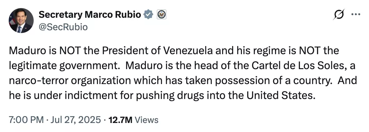 在2025年7月的社交平台X帖文中,鲁比奥说:“马杜罗不是委内瑞拉的总统,他的政权也不是合法政府。马杜罗是太阳集团(Cartel de Los Soles)的首脑,这是一个夺取了一整个国家的贩毒恐怖组织,而他因为向美国输送毒品而遭到起诉。”(网站截图)