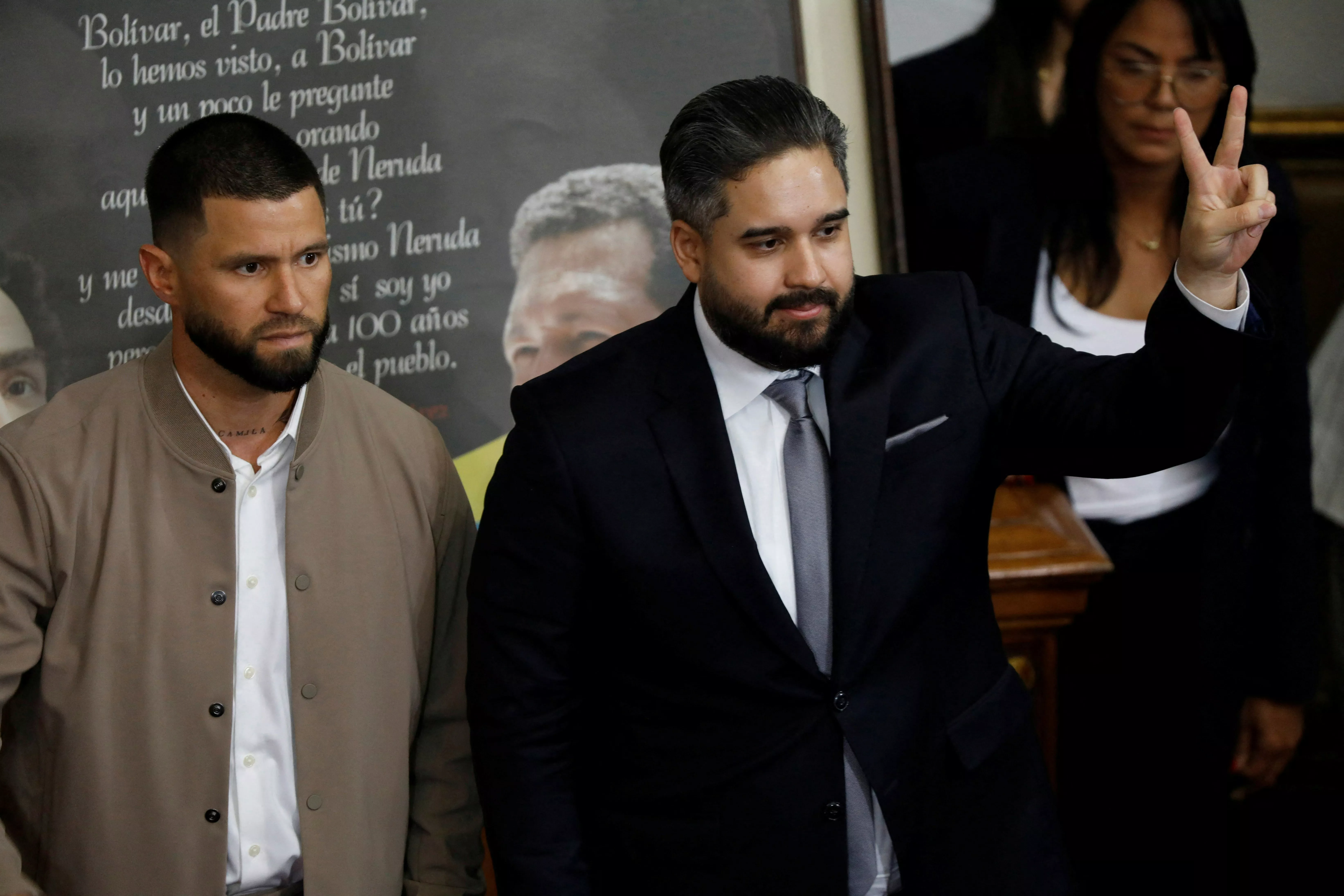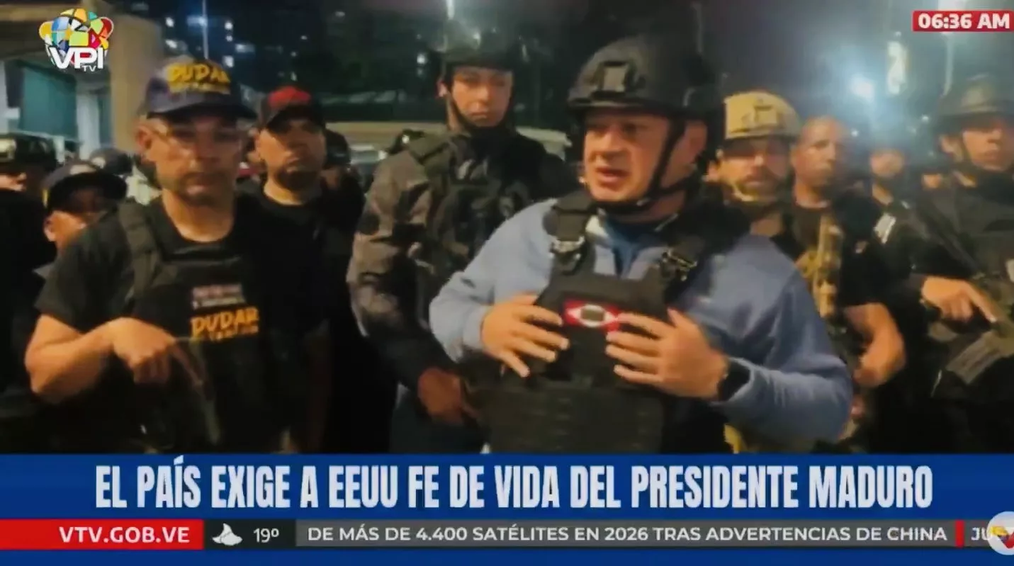 1月3日清晨,内政部长卡韦略在胸前戴上19世纪初委内瑞拉独立战争“誓死战斗”(Guerra a muerte)徽号现身。(X@3SJShop)
