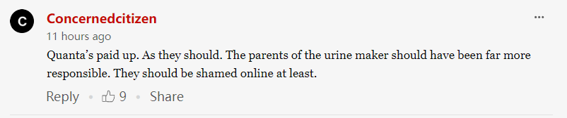 澳洲航空把钱付清,理应如此。尿液制造者的父母更应该负责任。至少应该让他们在网上蒙羞。