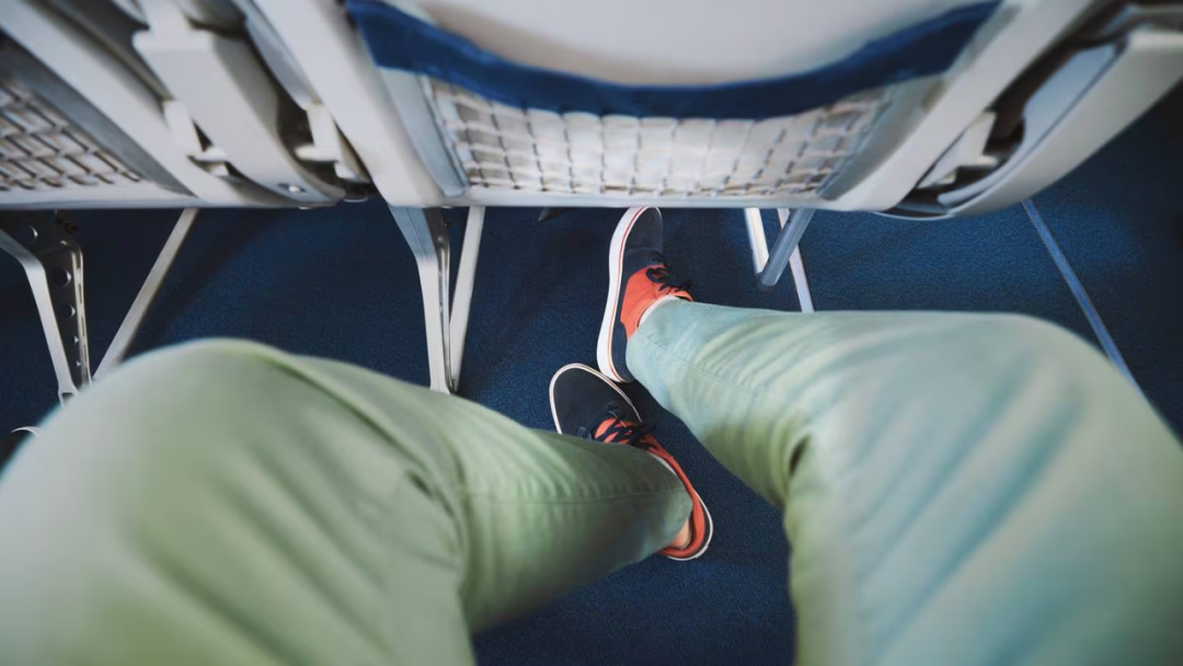 登机入座后,夫妇俩开始忙活整理刚在免税店买的东西,因为机上空间太小,丈夫就先把免税店买的东西和座位上的靠枕放在了前座下面的地板上。