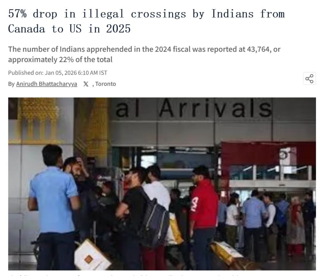 与此同时,另一个与此高度相关的现象是,从加拿大非法越境进入美国的印度人数量在2025年出现了大幅下降。根据美国海关与边境保护局(CBP)的数据,2025财年北部边境的非法入境拦截总数同比下降了57%,而被拦截的印度籍人士数量更是下降近68%。这一变化,被普遍认为与美国政府加大打击非法移民力度,以及对加拿大施压有关。