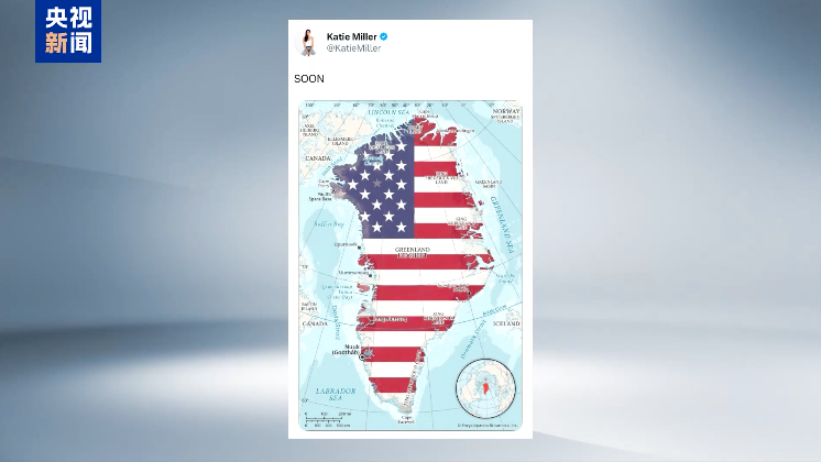 1月3日,美国白宫办公厅副主任斯蒂芬·米勒的妻子、前美国国土安全部官员凯蒂·米勒在社交媒体上发布了一张格陵兰岛的地图,图片上格陵兰岛被涂成了美国国旗的颜色。凯蒂·米勒还配发了一个大写的英文单词,“很快”。