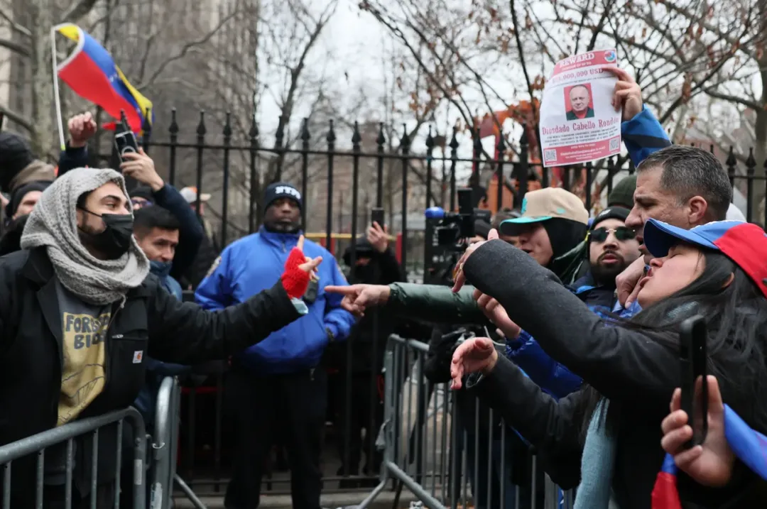 接下来再看一下法庭外的景象。曼哈顿下城的联邦法院外,支持马杜罗的抗议者和庆祝逮捕行动的民众分成了泾渭分明的两派。纽约警察局只能设置路障将双方隔离开。这里要补充说明一下,